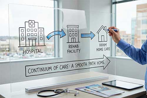 As your dedicated Rehab discharge partners, HHHM bridges the gap. We replicate the safety and routine of your facility in the client’s home, ensuring that the gains made during rehabilitation are preserved and built upon.